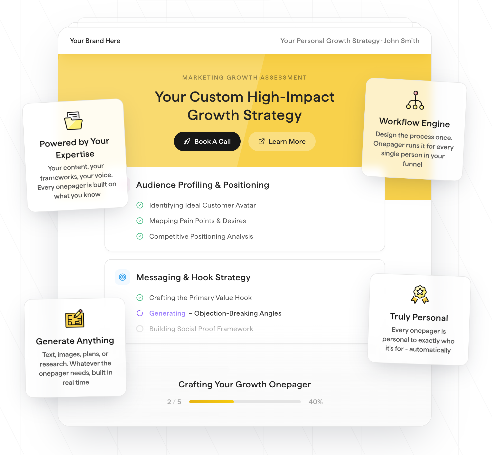 Your content, your frameworks, your voice. Every onepager is built on what you know